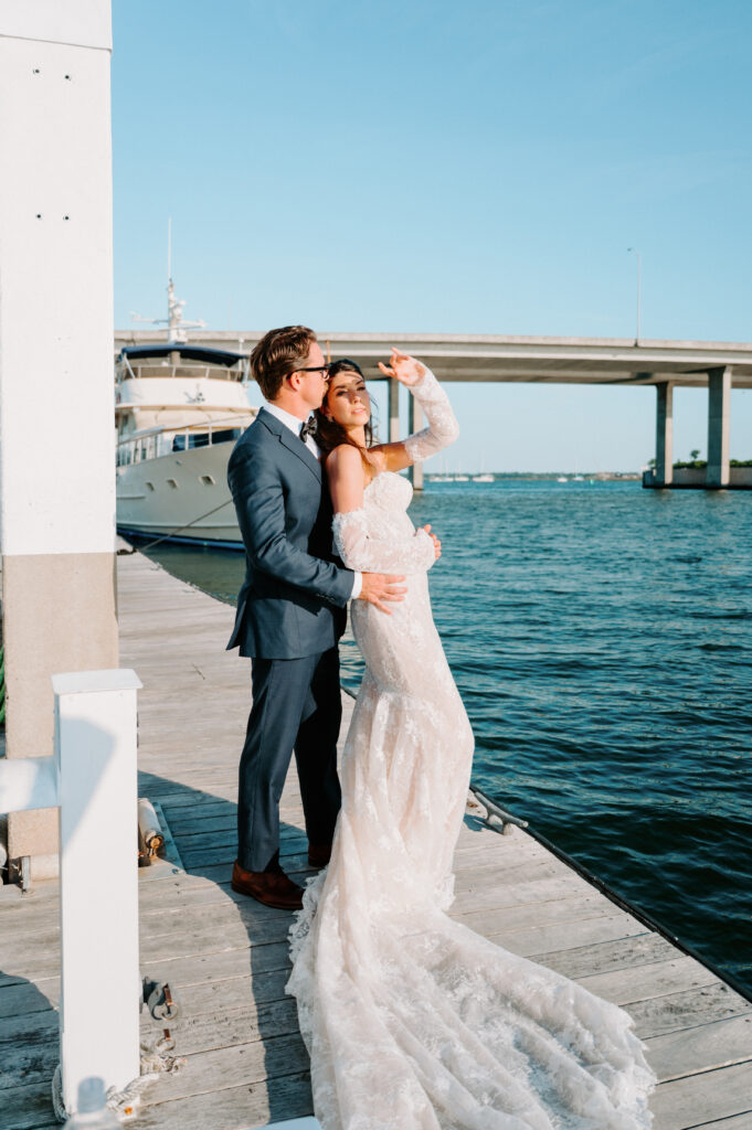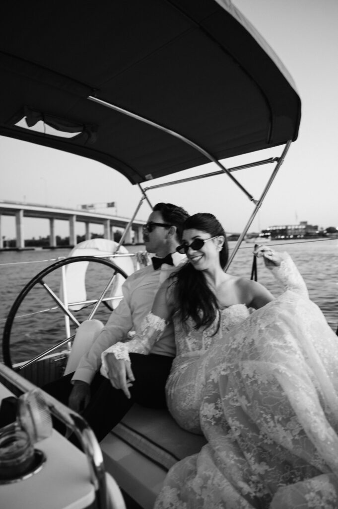 Flowy dresses, lightweight fabrics, and non-slip shoes are ideal. Avoid heavy gowns or long trains that could get caught in ropes or soaked by spray. Groom attire should also be comfortable for moving around on a boat while remaining stylish for photos.